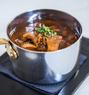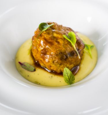 Albóndida guisada de rabo de toro con puré especiado de patata