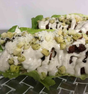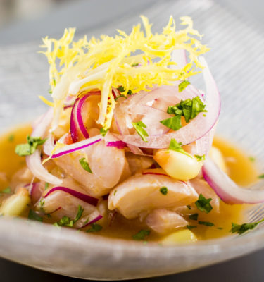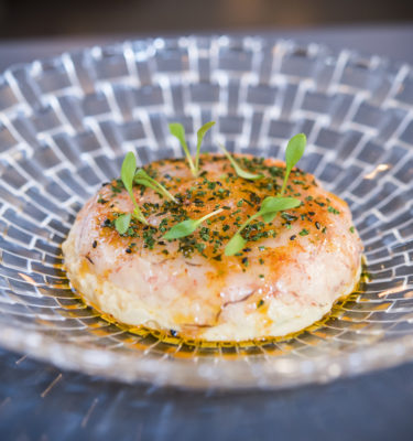 Ensaladilla de ají amarillo, tobiko y carpaccio de gambas